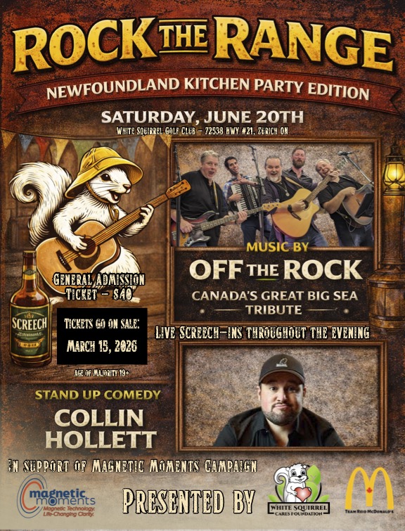 Rock The Range – Newfoundland Kitchen Party is a signature summer concert experience hosted at White Squirrel Golf Club, proudly presented by the White Squirrel Cares Foundation in partnership with Team Reid McDonald’s. This high-energy evening brings the spirit of an authentic East Coast kitchen party to Huron County, featuring Off the Rock – Canada’s Great Big Sea Tribute, along with stand-up comedy from Colin Hollett.